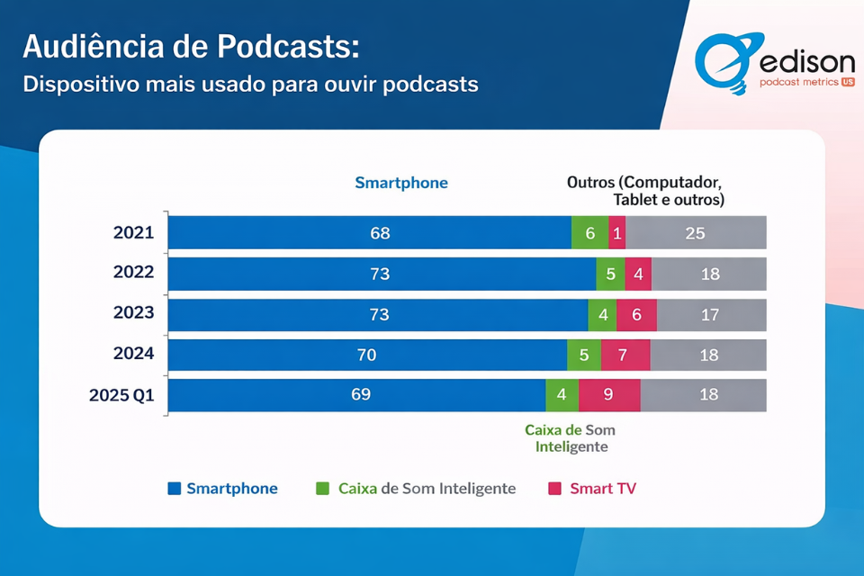 Segundo o Edison Podcast Metrics 2025, 69% dos ouvintes acessam podcasts pelo smartphone. Um dado que diz tudo: quem consome áudio hoje está no móvel. Para as rádios, o recado é claro: não basta estar no digital, é preciso estar onde a audiência realmente está.